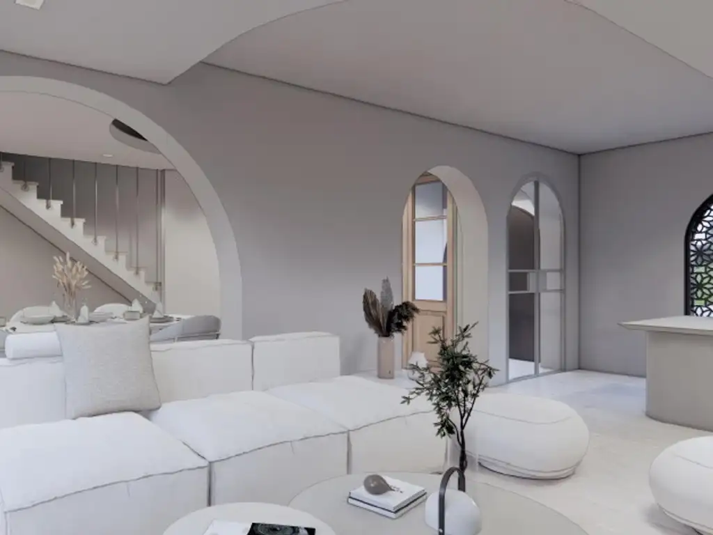 Acceso principal a un generoso living comedor integrado a una cocina de diseño moderno con isla central, ideal para reuniones informales. Completamente equipada con anafe, horno empotrado y mobiliario de alta gama. Dispone además de un espacio tipo escritorio o comodín, baño completo con ducha y un encantador patio descubierto.