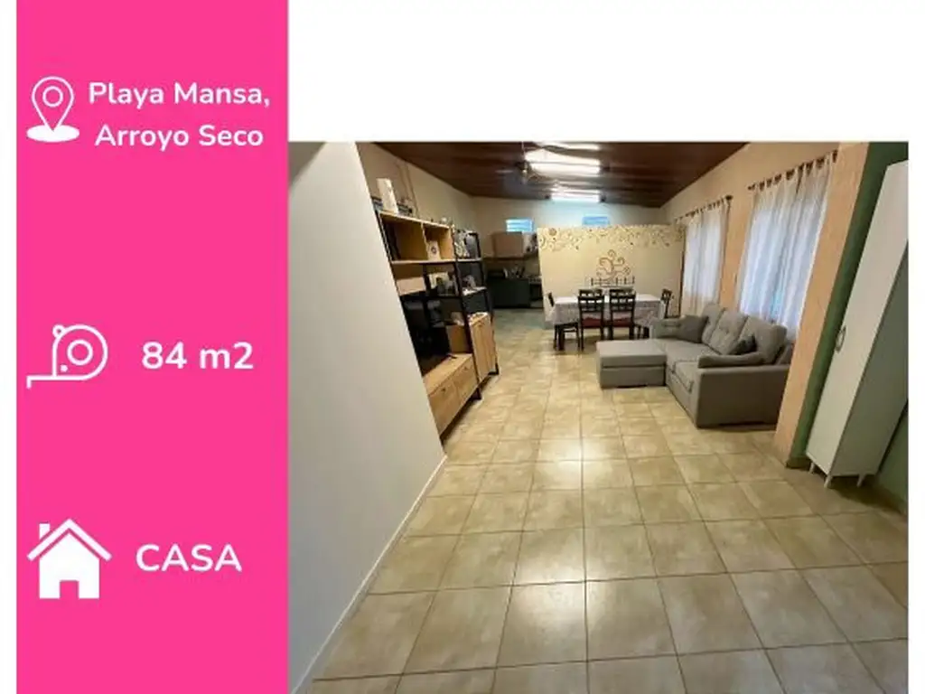 Casa/salón, con dos habitaciones, dos baños, cocina con parrillero y amplio comedor.