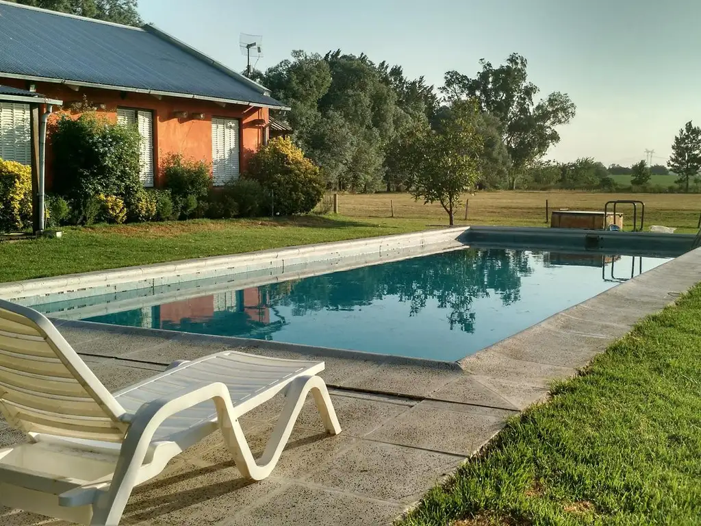 Casa estilo campo de 180m2 cubiertos y 20m2 de galería. Cuenta con cuatro dormitorios uno en suite, dos baños. Living-comedor con cocina integrada que conforman una superficie de 90m2 con grandes ventanales hacia la pileta y cancha de polo. Calefacción por moderna estufa a leña de doble combustión y estufas tiro balanceado.