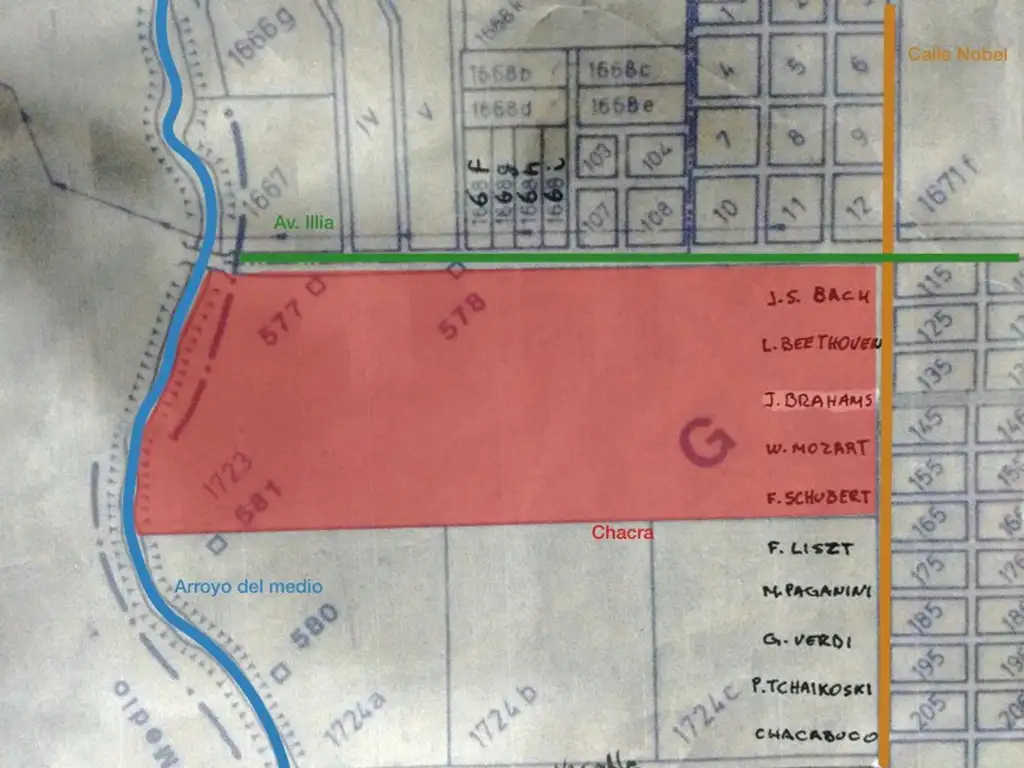 Medidas del lote: 1100 m sobre Av Illia, 400 m sobre calle Nobel, 400 m de costa sobre el Arroyo del Medio, limite con Pcia Santa Fe.