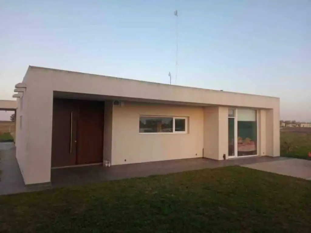 _ Casa de tres dormitorios en alquiler ubicada en el barrio privado La Faustina (Coronel Brandsen, Buenos Aires). Desarrollada en una planta, con disposición interna y orientación al noroeste.