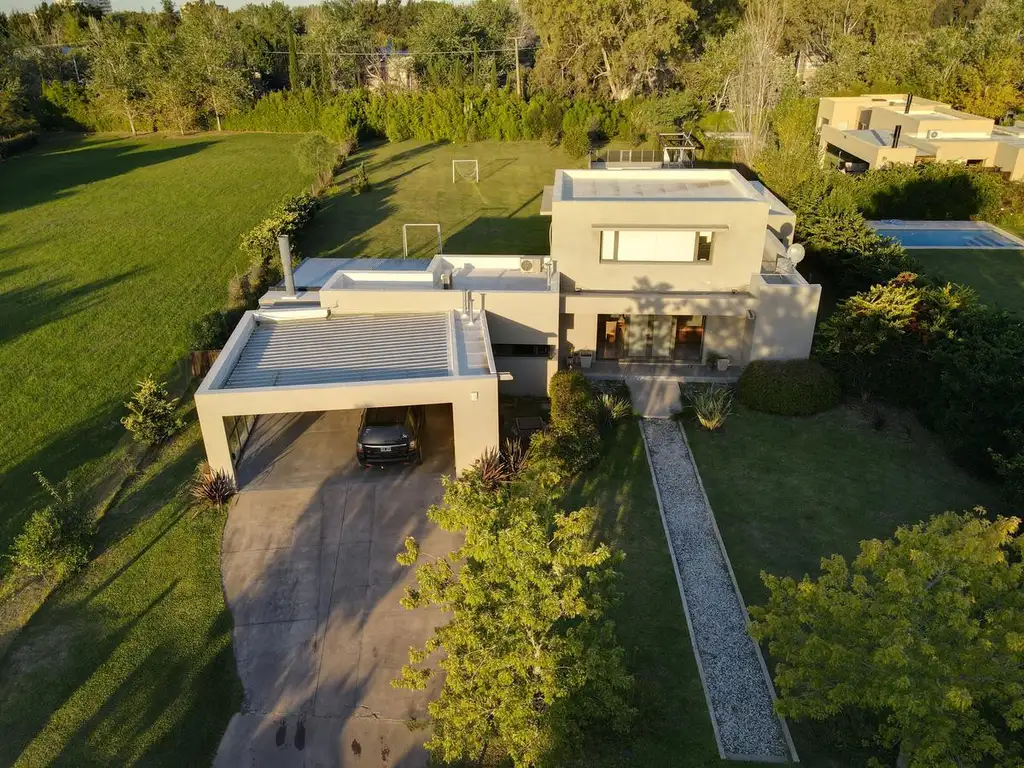 Casa moderna y luminosa desarrollada toda en planta baja compuesta por tres dormitorios, lavadero independiente, cocina comedor, living comedor, toilette, dormitorios en suite con vestior y otro baño complto, galería con parrillero, piscina con pergola, escritorio en planta alta.