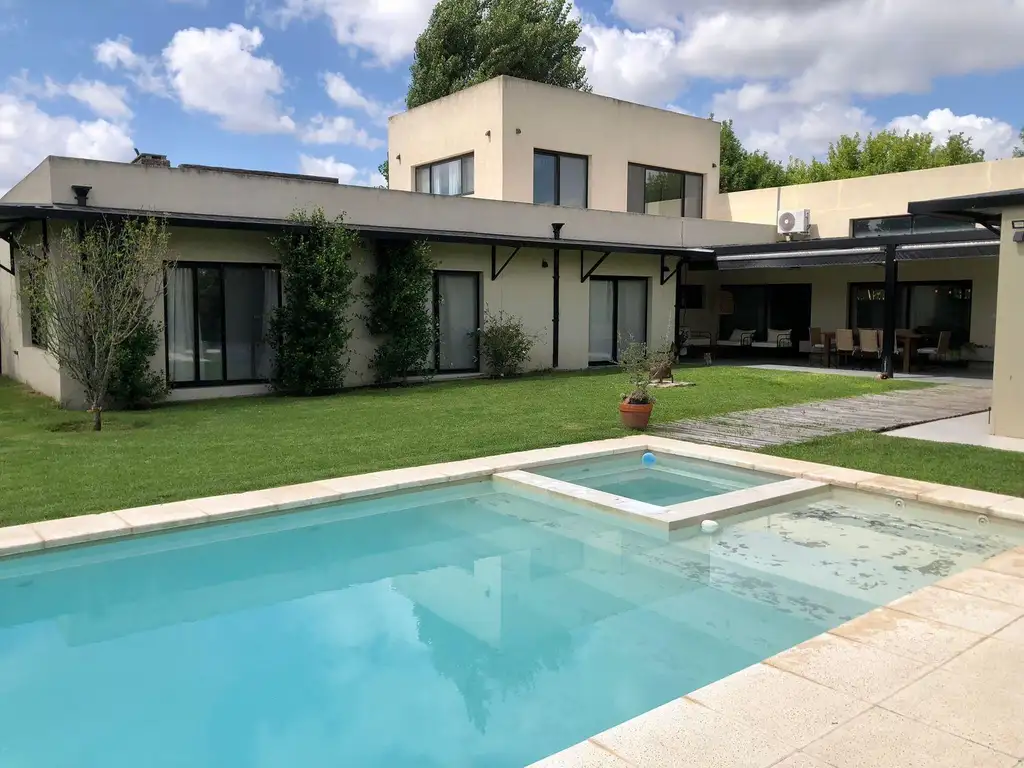 Bellísima casa ubicada cerca de la entradadel acceso al barrio, con jardín a la antigua cancha de golf convertida ahora en sendero para peatones y bicicletas.