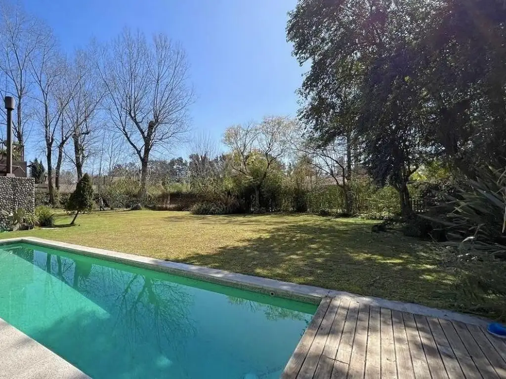 El exterior es un verdadero paraíso. El jardín está totalmente parquizado y cuenta con un sistema de riego automático, asegurando su mantenimiento en perfecto estado. Un gran quincho cerrado y luminoso con barra y family invita a disfrutar de reuniones sociales. Además, la propiedad cuenta con un baño de pileta para mayor comodidad. Las dobles galerías ofrecen un espacio ideal para relajarse: una con sector de parrilla y otra acondicionada como living al aire libre. La piscina, revestida y con deck y solarium, completa este oasis de lujo.