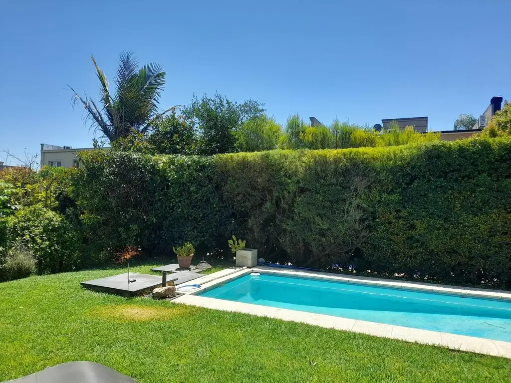 Exterior: Galería. Jardín con pileta de con bomba y filtro. Parrilla y espacio de guardado. Estacionamiento descubierto para dos autos al frente.