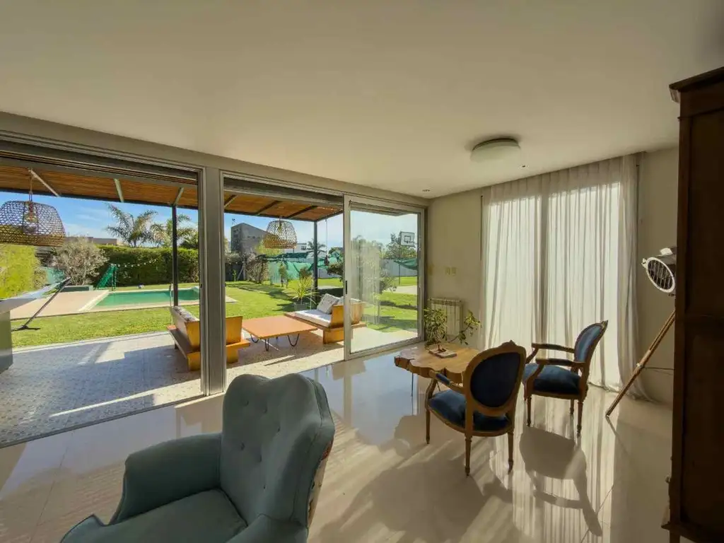 En el exterior, la casa cuenta con una galería de 8,50 x 4 m, parrilla, una piscina de 8 x 4 m y servicio de jardinería semanal. La cochera pasante tiene capacidad para 5 vehículos.