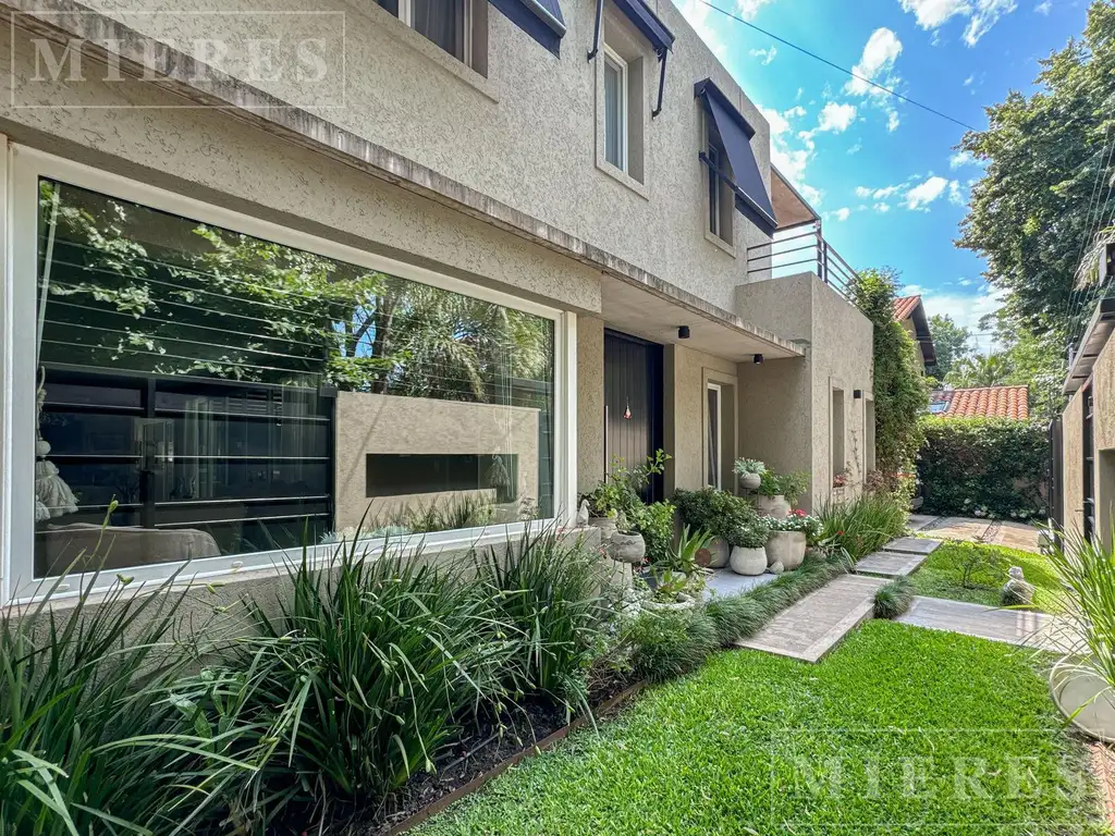 Jardín orientado al norte, con muy buena luminosidad. Gran galería cubierta que se integra naturalmente con la recepción principal , parrilla. La pileta se ubica en un sector cómodo del jardín, rodeada de verde y con muy buena privacidad. Lugar semicubierto para 2 autos
