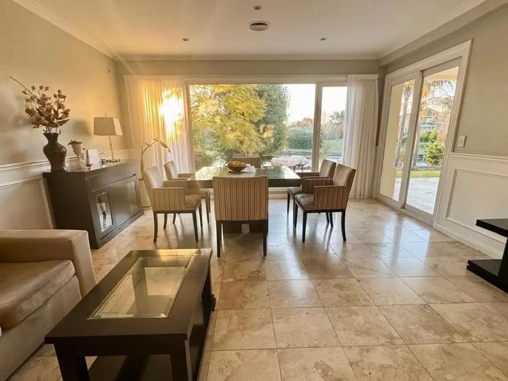 Ubicada en el prestigioso barrio La Isla, esta casa se distingue por sus amplios espacios y una distribución pensada para disfrutar del confort en cada ambiente. Al ingresar, un elegante hall conduce al living y comedor, ambos con salida al jardín, generando una conexión fluida entre el interior y el exterior.