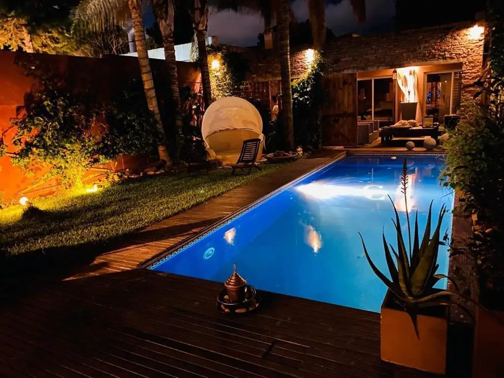 Desde el comedor, se accede al jardín, que incluye un deck, pasto, pileta, y un lavadero con baño de servicio (con ducha para la pileta). Al fondo, se encuentra un dormitorio completo con baño propio, en excelente estado y con detalles de terminaciones de alta gama. En esta planta, los revestimientos italianos y el porcelanato en la cocina son detalles que marcan la diferencia, junto con las terminaciones en Celestone.