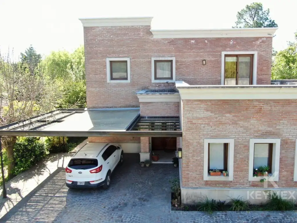 La casa se destaca por su amplia galería con parrilla, equipada con cocina industrial, extractor y ventiladores de techo, además de cerramientos de toldos cristal que permiten su disfrute todo el año. También cuenta con un depósito, y una espectacular pileta climatizada con cerramiento de acrílico transparente, perfecta para relajarse y disfrutar sin importar la estación. El sistema de riego por aspersión mantiene el jardín siempre verde y la cochera semicubierta ofrece espacio para dos vehículos.