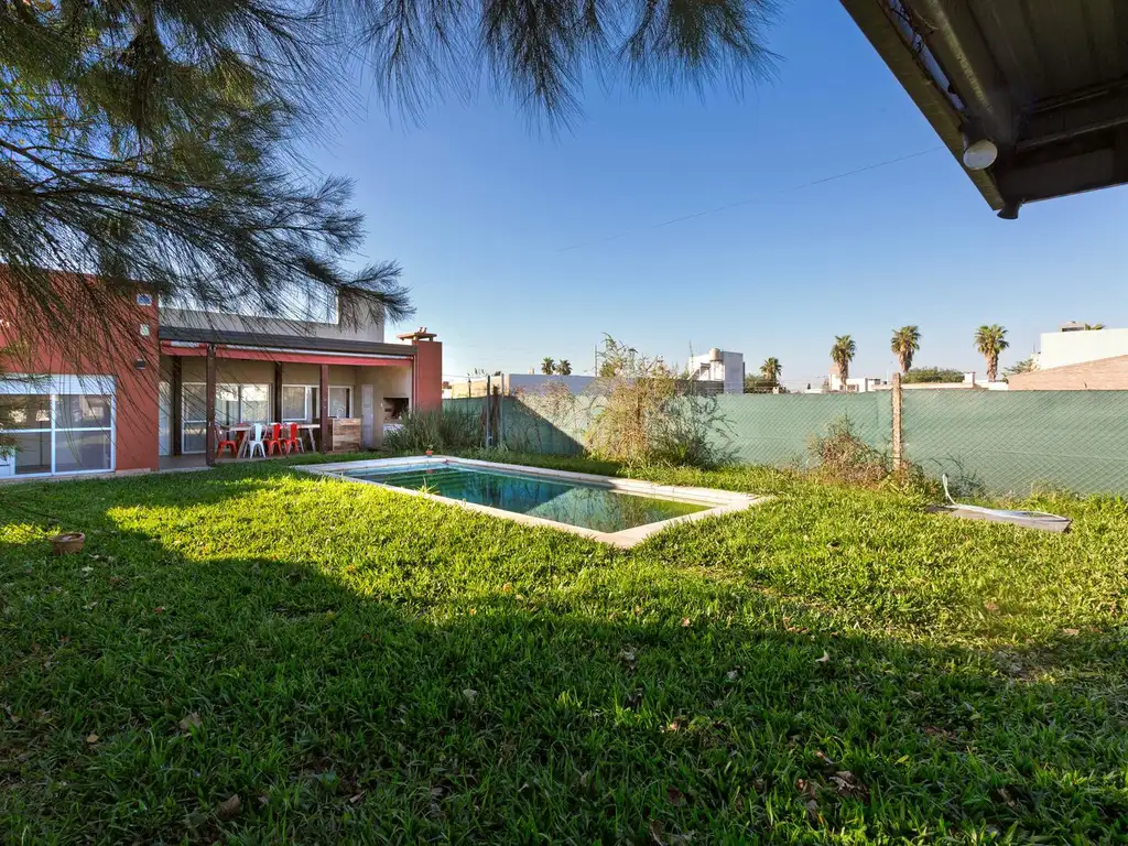 Descripción: Casa de dos dormitorios , uno de ellos en suite con jacuzzi y vestidor. El otro dormitorio principal tiene placard. Ambos con vista a aire libre . La casa cuenta con un ambiente para uso funcional de dormitorio comodín o escritorio. Cocina funcional con amoblamientos completos de bajo mesada, la cocina se integra al living comedor por medio de una isla . El ingreso de luz solar (cocina y comedor)es de Orientación Norte. Ventilacción cruzada por medio de ventanas y Puerta balcón que tiene salida a la galeria con pergola de madera , donde se encuentra el parrillero y una barra con bacha , creando así un espacio hacia el exterior y con vista al aire libre. Piscina de 6,50m x 3m con equipo de filtrado y Bomba instalada. Cochera semicubierta para dos automoviles.