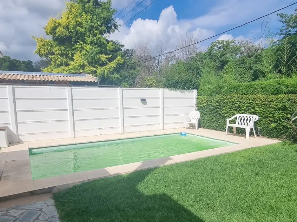 En la planta alta, se encuentran cuatro acogedores dormitorios, siendo el principal en suite, y un baño que atiende a las áreas comunes. El exterior es un verdadero oasis, con una galería que incluye parrilla, una refrescante pileta con filtro y un solárium perfecto para los días de verano. Este hogar permite la presencia de mascotas pequeñas, asegurando que toda la familia sea bienvenida. Con servicios como agua corriente, aire acondicionado, gas natural, internet y seguridad, esta propiedad combina la calidez de un hogar con las comodidades modernas. Además, dispone de dos cocheras semicubiertas y un entorno arbolado que realza su atractivo. No dejes pasar esta oportunidad de vivir en un lugar excepcional.