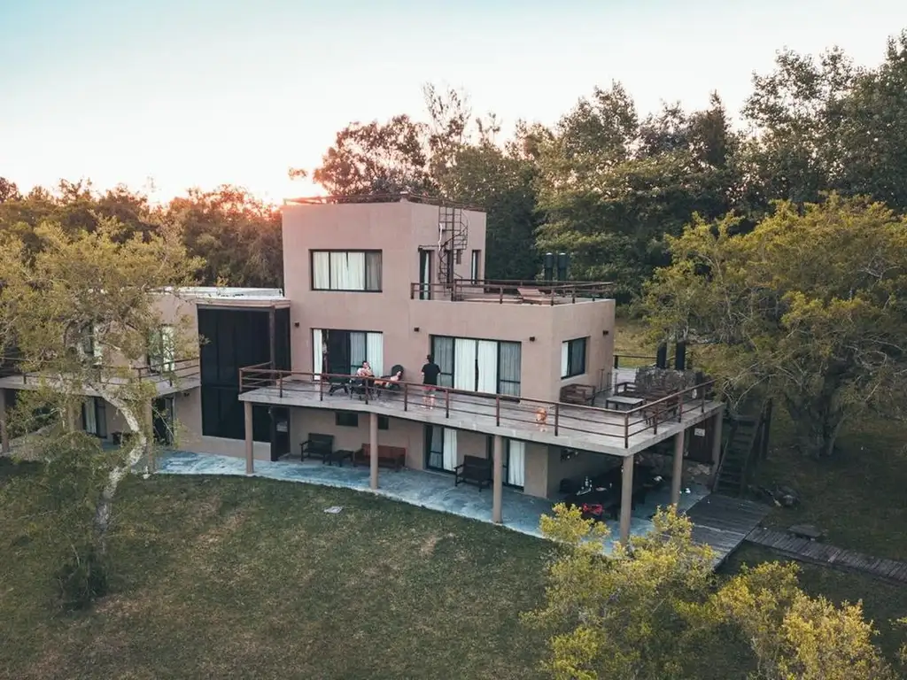En planta principal: recepción, comedor y gran living con chimenea, ambos con salida a deck con parrilla con ESPECTACULAR VISTA hacia lel bañado, cocina con comedor diario. 2 dormitorios que se pueden unir y baño completo, que sirve tambien como Toilette.