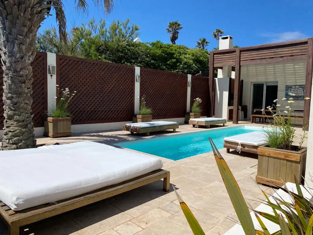 Planta baja: Amplio living comedor con excelente vista al mar y salida al deck delantero y trasero. Toillete, parrillero, pileta y suite de huéspedes con acceso independiente. Estacionamiento para dos autos.