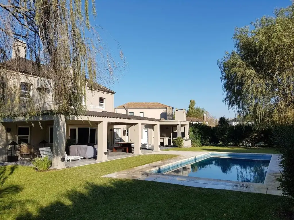 Afuera gran jardin parquizado con pileta graleria quincho con parrilla