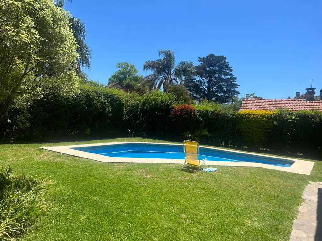 Exterior: hermoso parque, galería cubierta, parrilla y excelente piscina.