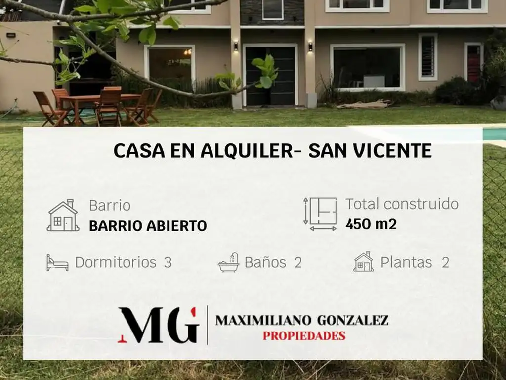 Casa en alquiler ubicada en barrio abierto, San Vicente. Excelente casa para 10 personas. 3 habitaciones. 2 baños. piscina iluminada. parrilla....Elegí la vida que deseas vivir...MG - Maximiliano González Propiedades..Lotes y casas en venta