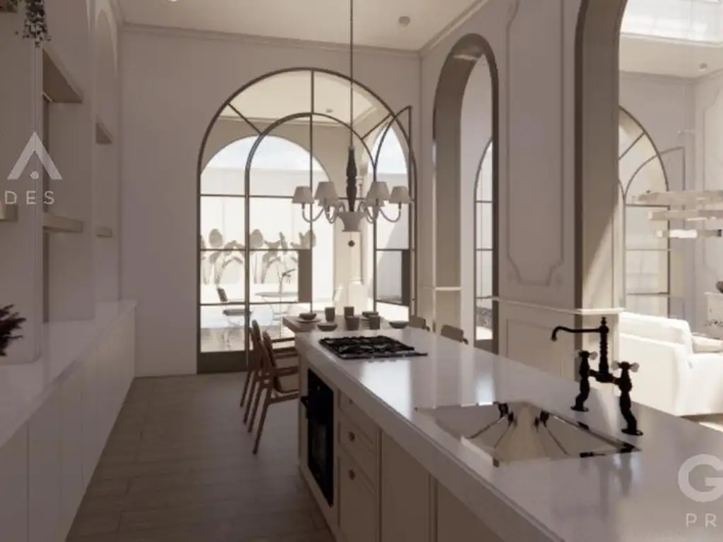 Planta baja: ingresamos al sector de Living comedor de amplias dimensiones que se encuentra integrado a la Cocina de diseño, totalmente equipada con anafe, horno, alacenas y bajo mesadas. En el centro se ubica una mesada en forma de isla donde se proyecta el espacio de comedor diario. Sector de despensa y un toilette. .