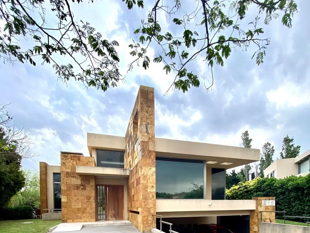 Planta baja : Gran hall de entrada y toilette de recepción. Hermoso living en doble altura revestido en madera con pisos de mármol. Cortinas en doble altura motorizadas, increible vista a la piscina desde el interior.