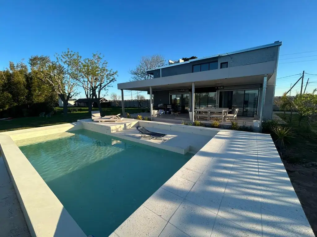 PB: living, cocina comedor integrado por isla con muebles bajo y sobre mesada, toilette, escritorio, cochera cubierta para 2 autos, galería semi cubierta, pileta, quincho, gran parque.