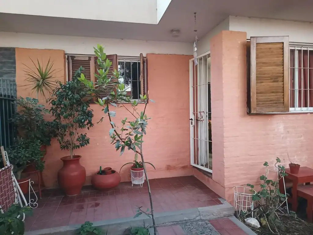 El acceso principal cuenta con patio de recibimiento y potencial área para cochera. La cocina presenta muebles de madera con bajo mesada y alacenas, conectándose armónicamente con un patio interno que amplía los espacios exteriores. Los dormitorios incluyen placares empotrados que optimizan el almacenamiento.