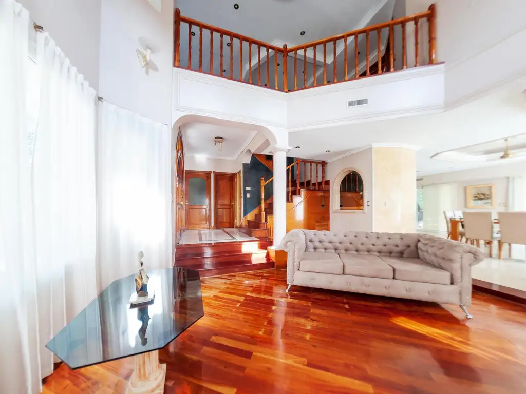 imponente Hall de entrada ,,Living con hogar a leña , con doble altura , . Cocina con Comedor diario. isla en mármol negro ,