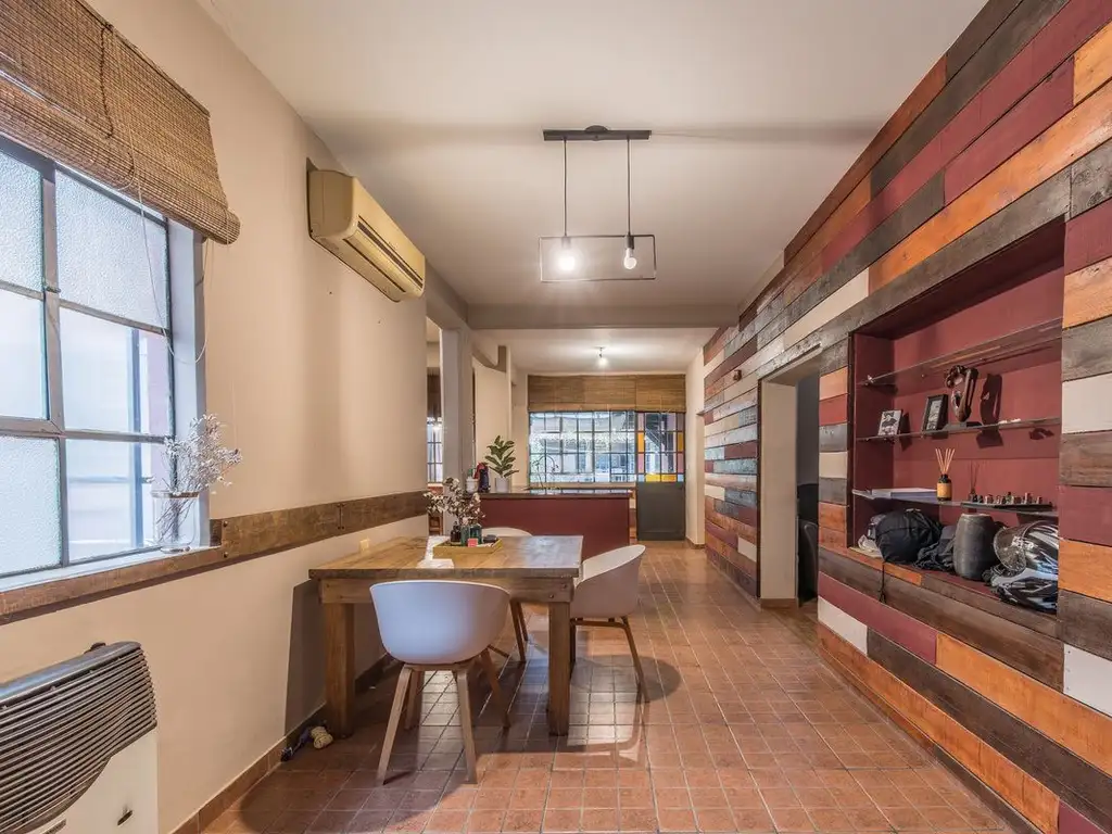 Hacia el fondo, encontramos la entrada a un espacio que combina de manera semi integrada la cocina comedor practica, de buen tamaño y con buen espacio de guardado; los espacios para living y comedor que se encuentran separados por un hogar, que le aporta calidez al ambiente. El living hoy se encuentra armado donde originalmente había una cuarta habitación o escritorio, por lo que ofrece la flexibilidad para ser nuevamente dormitorio, sala de juegos o espacio de trabajo según la necesidad.