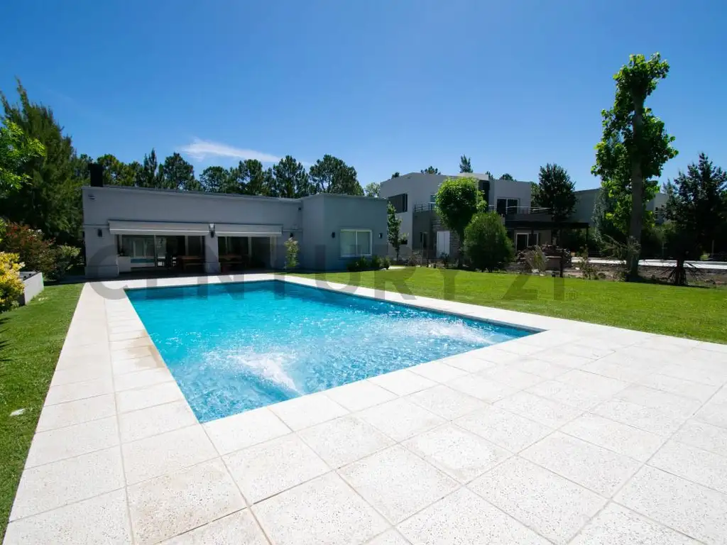 Los ambientes están todos integrados, la cocina totalmente equipada, con una mesada tipo barra de mármol de carrara al igual que la mesada. El estar comedor luminoso con hermosas visuales del jardín y con una muy buena comunicación con la galería semi cubierta, tipo quincho, con Parrilla y la piscina. Toilette y lavadero cerrado. Otro sector más privado comprende tres dormitorios de los cuales dos de ellos con placares y un baño que los asiste y el dormitorio principal cuenta con baño en suite.