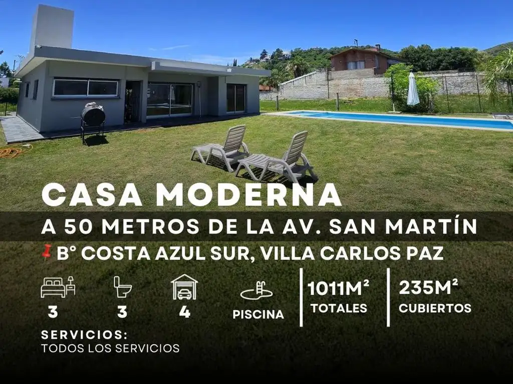Casa 3 Dormitorios Con Piscina 1000M² Parque, Todos Los Servicios. Costa Azul Sur, Villa Carlos Paz