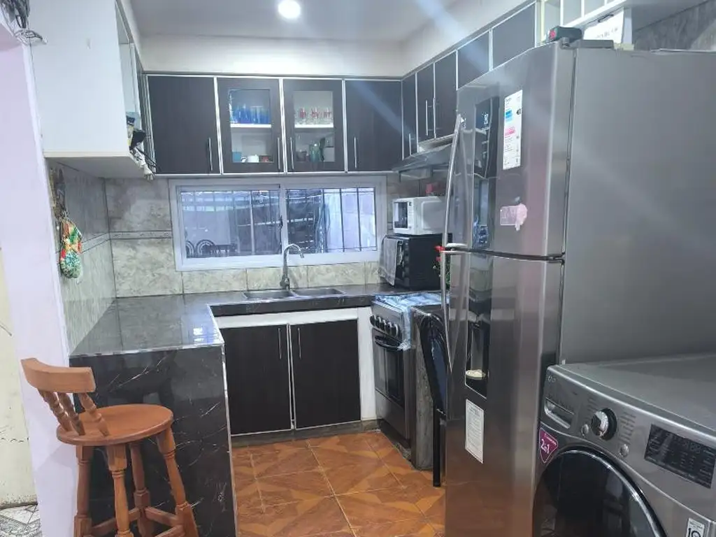 Planta baja: living comedor con aire acondicionado, cocina, un dormitorio, un baño y un taller 10 x 2,50 con cortina metalica