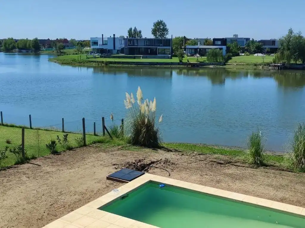 Planta Baja: Living-comedor con gran ventanal y lindísima vista a la pileta y a la laguna. Toilette de recepción. Escalera de diseño. Cómoda cocina semi-integrada. Lavadero. Escritorio o Dependencia de servicio. Parrilla. Pileta. Cochera.