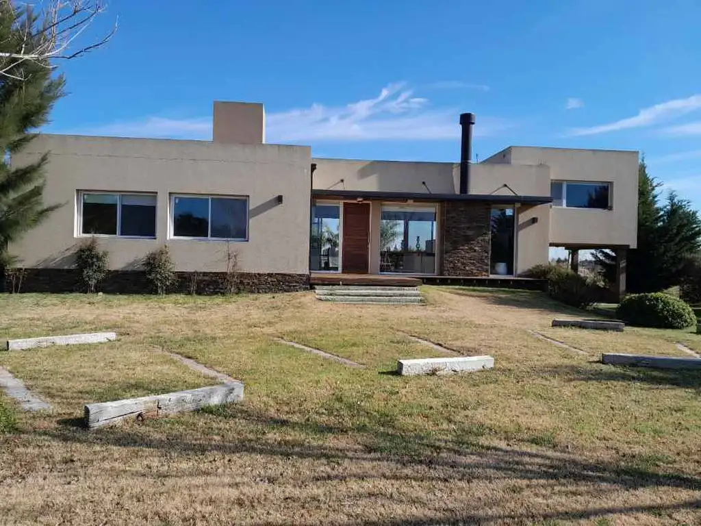 Hermosa casa 5 ambientes desarrollada en una sola planta sobre un lote de 1520m2. Cuenta con cocina con isla integrada al living comedor, lavadero independiente y tres habitaciones: una en suite con vestidor y dos que comparten baño. Posee un entrepiso con un espacio tipo playroom.