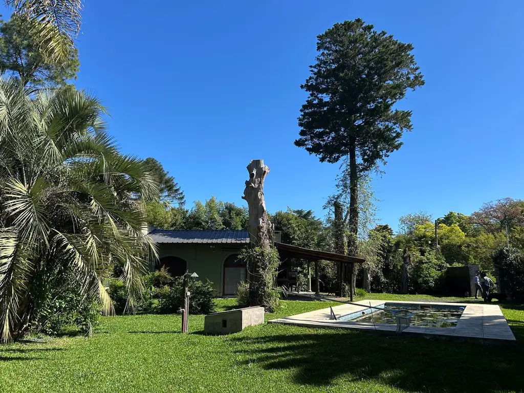 En el exterior, el lote se encuentra totalmente parquizado y arbolado, con palmeras de gran porte que aportan un entorno natural y relajado.