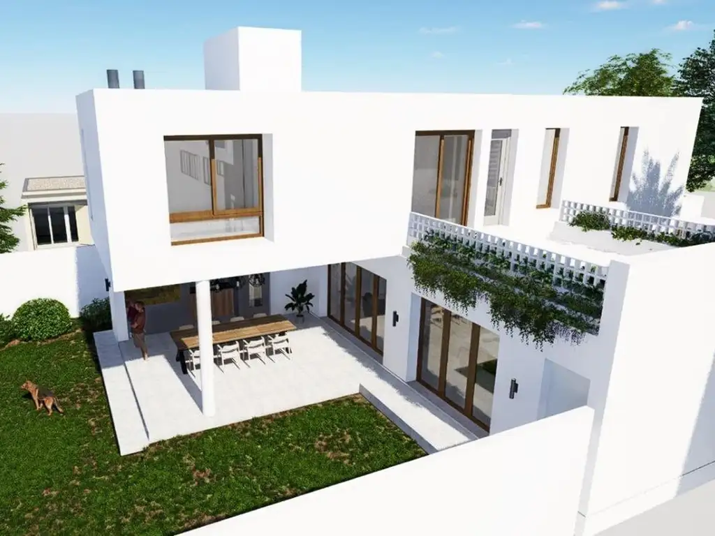 Casa de dos plantas. Planta baja: garage doble, living, cocina-comedor, baño, escritorio y galería con asador. Planta alta: tres dormitorios y dos baños.