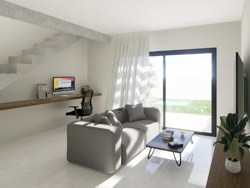 Moderna vivienda desarrollada en dos niveles, con un diseño funcional y excelentes terminaciones. Ingreso principal a un hall recibidor que conecta con un amplio living comedor y cocina integrada en forma de L. Este espacio principal cuenta con grandes ventanales que brindan una excelente entrada de luz natural y salida al jardín trasero. En planta baja también encontramos un toilette, y un espacio previsto para escritorio o sector de home office.