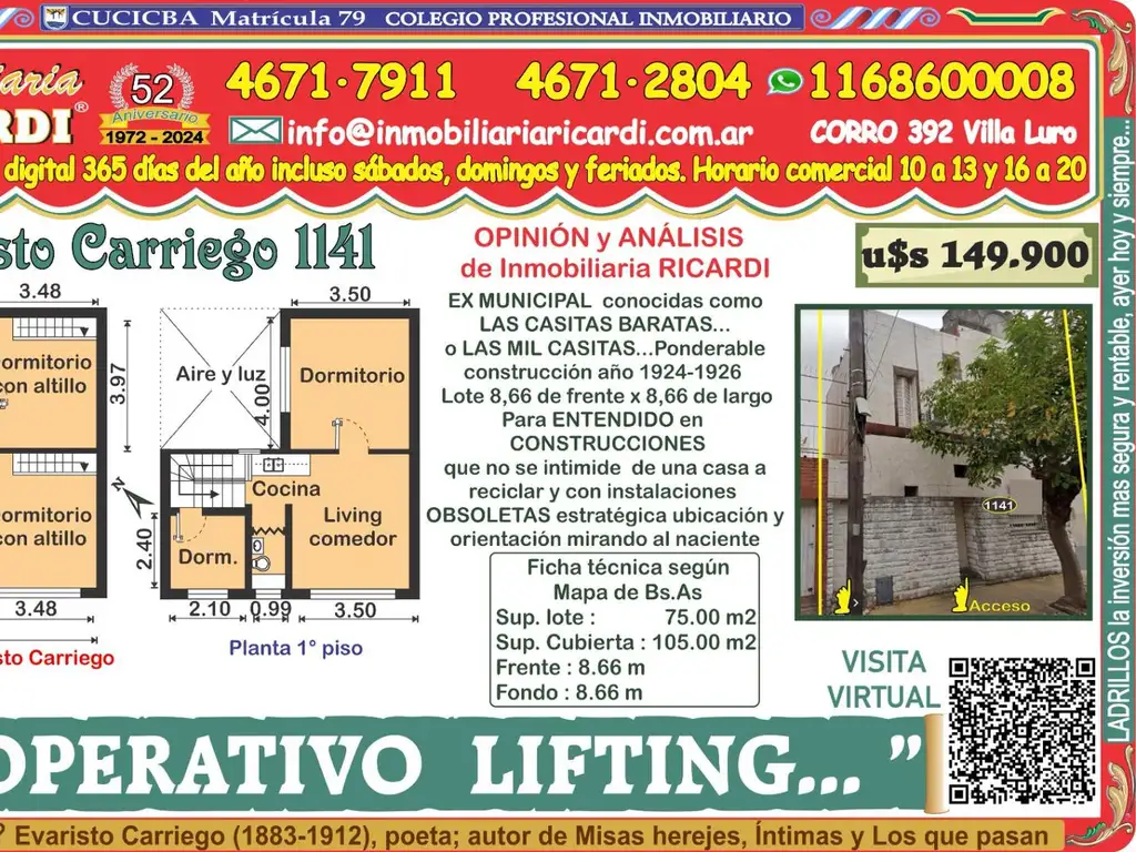 La Inmobiliaria RICARDI NO garantiza que el inmueble cumpla con el certificado de conservación de fachadas y balcones (Ley 257) tampoco efectúa el estudio de títulos, ni analiza los alcances del Código de edificación y no será responsable por los vicios ocultos o redhibitorios que competen a quien corresponda. Advertimos al adquirente que las instalaciones eléctricas, de gas natural y-o sanitarias pueden NO solo no tener un correcto y adecuado funcionamiento técnico sino que además puede NO cumplir con las exigencias actuales de METROGAS- EDESUR- EDENOR - siendo a cargo del adquirente que implique su puesta en valor y-o funcionamiento.