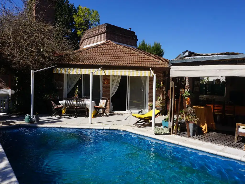 En planta baja encontramos un amplio living muy luminoso con chimenea de buen tiraje, seguido por un comedor con amplios ventanales a la pileta y doble acceso a la cocina que tiene salida externa. Arriba de la cocina tiene una amplia bodega/baulera y también tiene un garage para 1 auto y cochera descubierta para 2 autos.