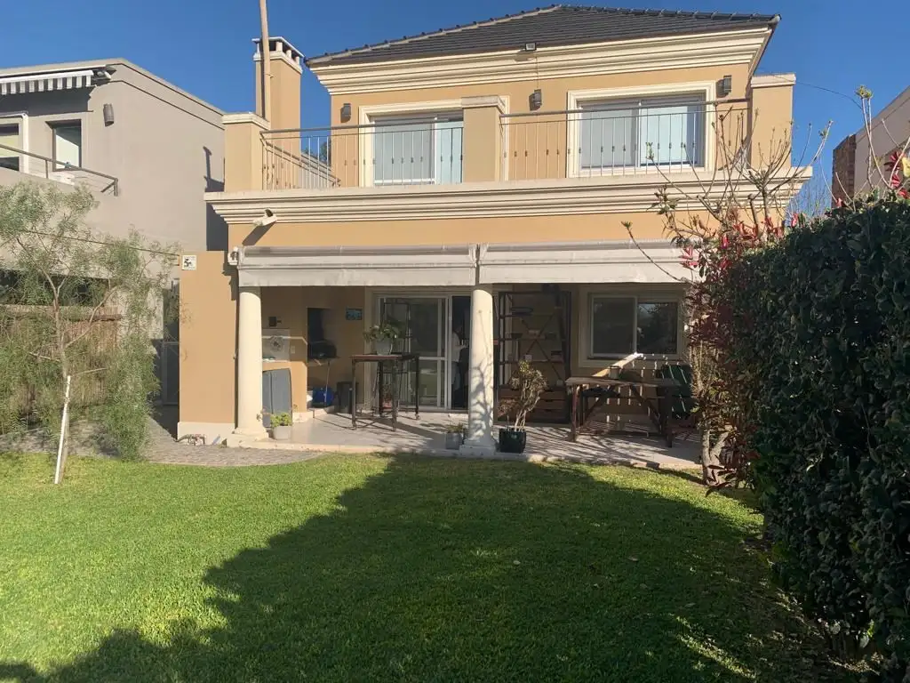 DESARROLLADA EN DOS PLANTAS, LA PLANTA BAJA CUENTA CON LIVING COMEDOR CORRIDO A GALERIA, COCINA SEMI INTEGRADA CON ISLA, LAVADERO, GALERIA CUBIERTA CON PARRILLA Y CERRADA CON TOLDOS. MESADA EXTERNA CON BACHA. GARAGE CUBIERTO PARA DOS AUTOS, TOILETTE DE RECEPCION, ESCRITORIO O 4TO DORMITORIO, JARDIN PARQUIZADO CON GRAMA Y PISCINA CON FILTRO.