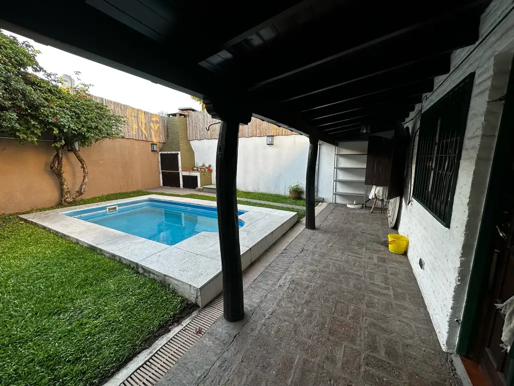 En la planta baja, se encuentra un amplio living, una cocina comedor integrada, dos dormitorios luminosos con un baño compartido, una galería colonial que conecta con el jardín, una pileta de generosas dimensiones, un espacio de parrilla ideal para reuniones, lavadero independiente y una cochera techada.