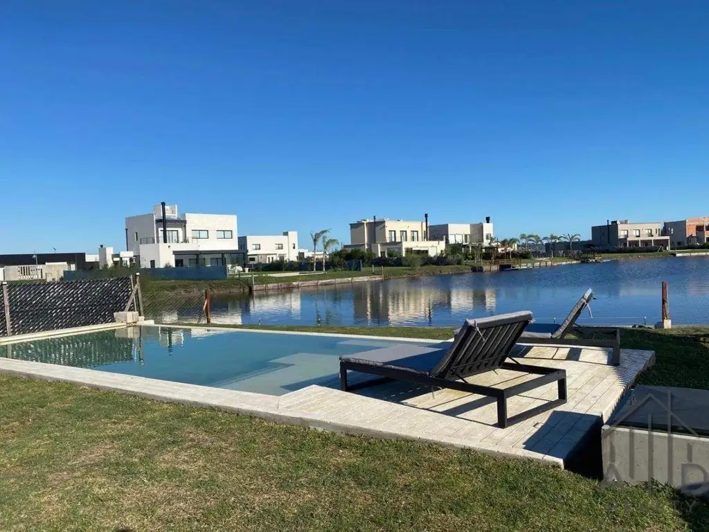 En la planta baja, la casa dispone de una amplia entrada de autos que incluye dos cocheras cubiertas y dos descubiertas. Un luminoso living de doble altura, una gran cocina con isla central y un amplio living-comedor complementan el espacio, junto a un baño, lavadero con acceso desde el jardín, despensa, oficina que puede convertirse en habitación, y un quincho vidriado con parrilla que se abre a un extenso parque con pileta. En la planta alta se encuentran tres dormitorios, uno de ellos en suite con vestidor y acceso a una gran terraza con increíble vista a la laguna, además de un segundo baño.