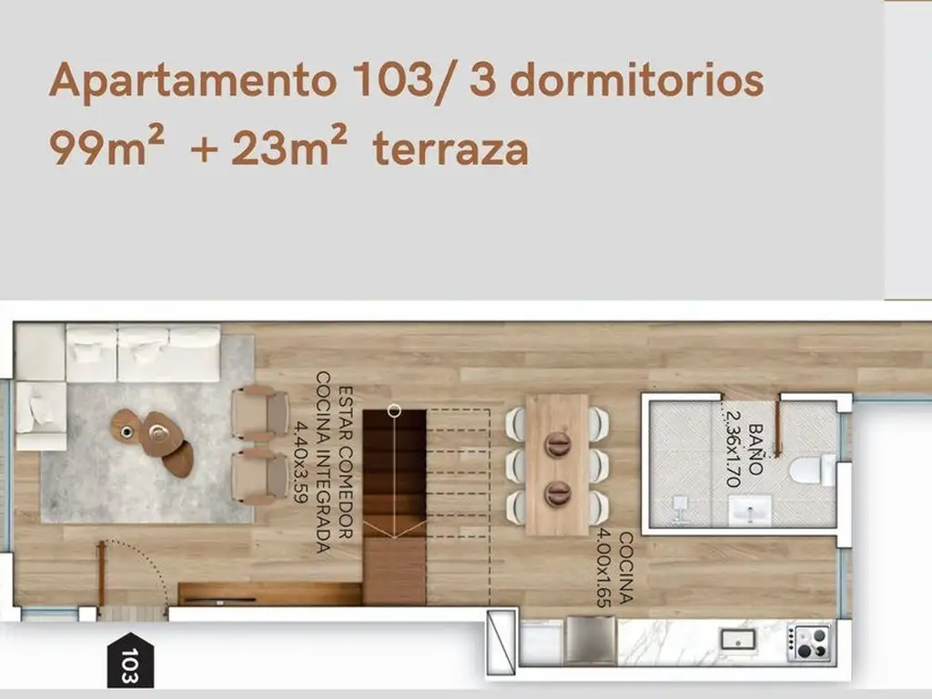 Unidad 103 en planta alta, en un condominio de 8 unidades independientes, sin gastos comunes.