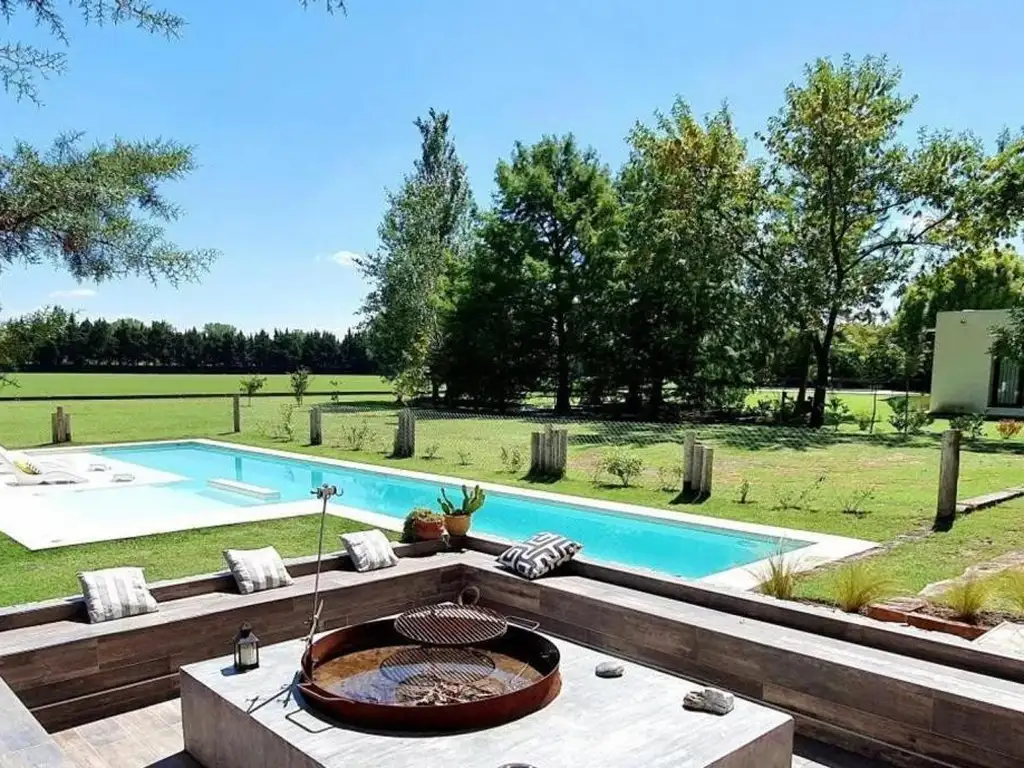 En el exterior, desde la galería con parrilla, hay una hermosa vista al jardín, y a la cancha de Polo, lo que hace súper agradable pasar momento alli. Hay un espacio con importante fogón. Piscina calefaccionada, y espacios verdes que hacen de la casa una excelente opción para vivir y vacacionar