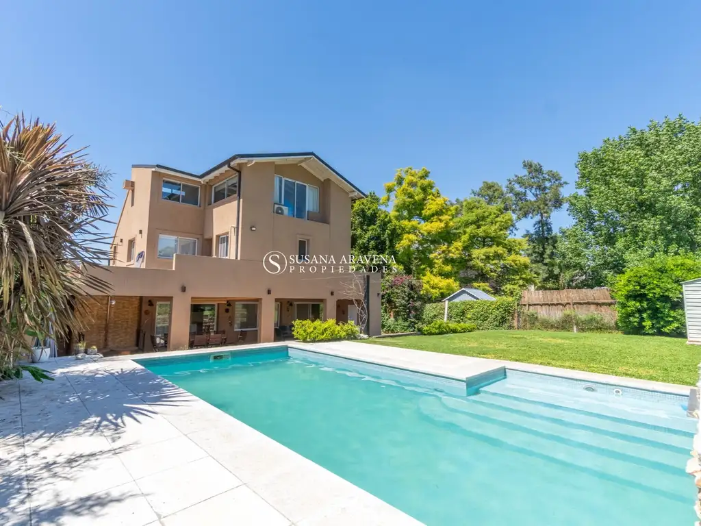 Planta baja:- Al ingresar, un gran hall de entrada con toilette de visitas y un placard de recepción amplio.- Living comedor integrado, muy espacioso, con ventanales que ofrecen salida al jardín y vistas verdes. La casa es súper luminosa durante todo el día. Cuenta con ventanas DVH en toda la propiedad y pisos de porcelanato símil madera nuevos.- Cocina completa con excelentes terminaciones, spar, isla y gran capacidad de guardado. Incluye ventanales al frente, correderas telescópicas y iluminación bajo mesada.- Galería amplia con parrilla, bacha y baño. Espacio ideal de estar con vistas al jardín de doble altura.- Jardín Super verde Excelente parquizado, SOL TODO EL DIA ! con pileta equipada con filtro automático y cascada. Riego automático. Espacio de guardado extra para materiales diversos.