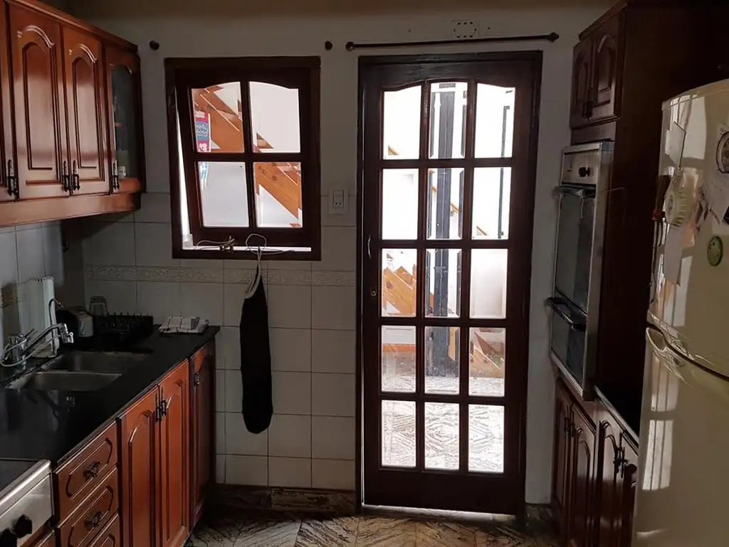 Planta baja con hall de acceso amplio. Cocina comedor completa, con muebles bajo y sobre mesada de madera.