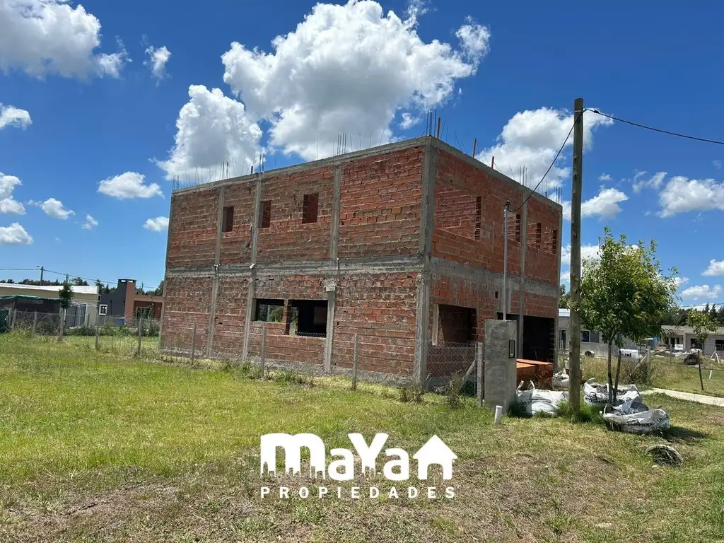 La estructura de hormigón armado se encuentra completamente ejecutada (columnas, vigas y losa), con mampostería perimetral y divisiones interiores levantadas en ambas plantas. Escalera de hormigón ya materializada y terraza transitable definida.