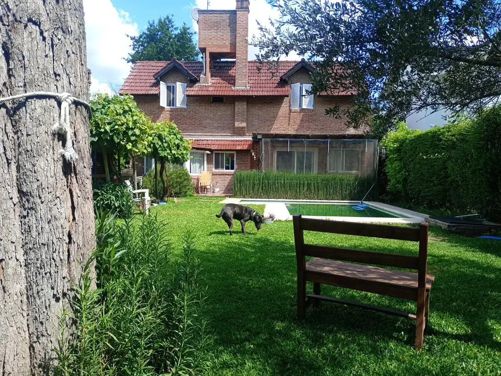 El exterior de la casa se inicia con una galeria cubierta que comunica a un soñado jardín rodeado de arboles y verde, con pileta, parrilla y todo para disfrutar al aire libre. En la planta alta se encuentran los tres dormitorios, uno de ellos con salida a una pequeña terracita y ambos comparten un baño completo. El dormitorio principal es en suite con placard.
