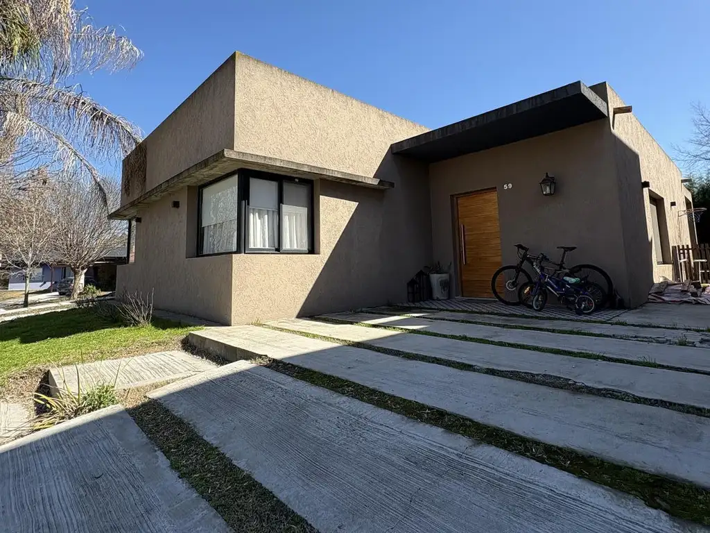 Cuenta con 3 dormitorios, uno en suite con vestidor pasante y baño compartimentado. Los otros 2 con placares, baño completo. Amplio living-comedor con cocina integrada, separada con barra, equipada con muebles bajo mesada y estantes. Espacio para heladera de dos puertas. Lavadero y alacena. Galería cubierta con parrilla. Piscina de fibra. Patio lateral, jardín. Ingreso lateral. Grandes ventanales que se abren totalmente hacia la galería. Construcción tradicional , techo de losa, pisos de porcelanato. Agua caliente por termotanque. Realmente una casa comodísima con un diseño moderno y práctico, con detalles de confort.
