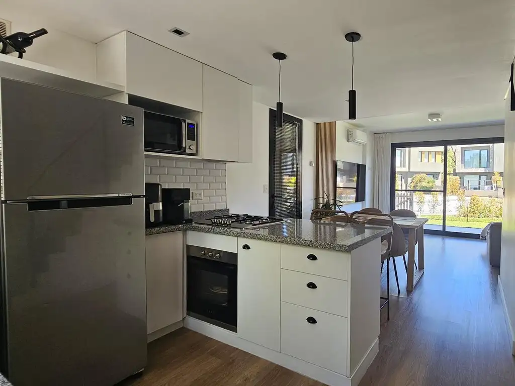 La propiedad se desarrolla en dos plantas. Al ingresar, una puerta principal de madera maciza estilo ciprés nos conduce a la cocina integrada, equipada con alacenas, muebles bajo mesada y espacio para lavavajillas. Una barra funcional aporta más guardado y conecta con el amplio living comedor, muy luminoso gracias a un ventanal con salida al jardín propio de 4x3 m. En esta planta también se encuentra un toilette, un práctico espacio bajo escalera y acceso directo a la cochera techada para un auto, con lavadero y parrilla completa.