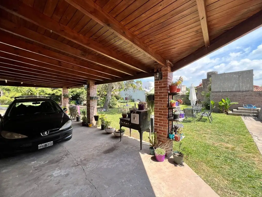 Galería semicubierta con parrilla y espacio para vehículos