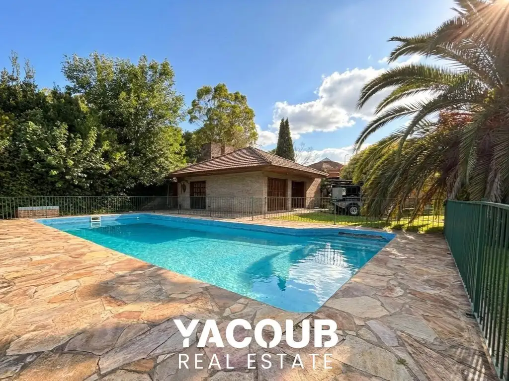 _ Quincho espacioso con parrilla, un baño completo con vestuario y sala de herramientas. Amplia y luminosa, cuenta con gran patio con pileta de 12m x 5m. Dos espacios cubiertos de guardacoches con una capacidad para tres vehículos.